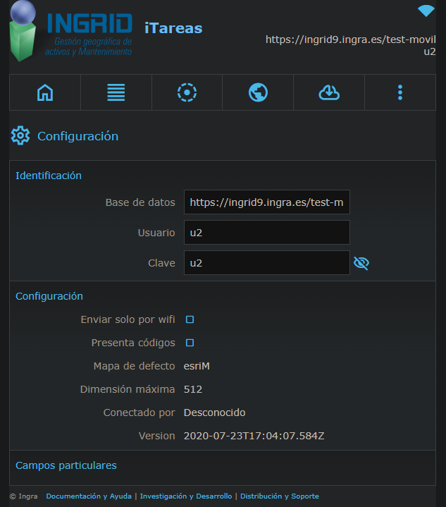 2. Poner el nombre de BD con la que trabaja, su nombre de usuario y contraseña (siempre se puede probar la BD de demo test-movil con usuario y contraseña= anonimo). ATENCIÓN a que el servidor de defecto es el servidor principal: i4.ingra.es, si su base está en otro servidor hay que poner el camino completo del host, como por ejemplo: ingrid9.ingra.es/elsamex-estacion
