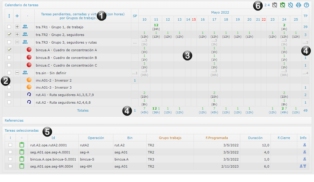 Cualquier multiselección de tareas realizada desde cualquier control del calendario, se lista aquí para poder operar con ella. Puede provenir de un clic en la rejilla de fechas y grupos/bins (3), o de una multiselección con las casillas de las líneas en la zona de grupos (2).