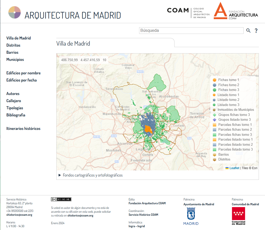 Web pública de legados del Colegio de Arquitectos de Madrid, añadiendo búsqueda en lenguaje natural en la web directamente contra el motor de BD de la web de redactores en versión Ingrid 8 a través de un webservice.