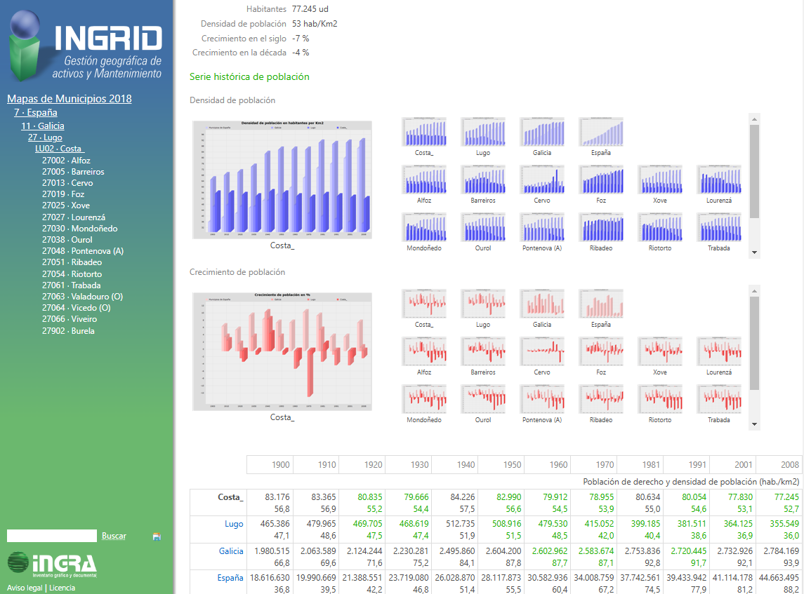 Sitio con mapas vectoriales y de referencias a ortofotos para los 8.255 municipios de España, sus Comarcas, Provincias y Comunidades Autónomas. Para cada espacio existe información de población, densidad, crecimiento... con tablas de datos numéricos y mapas temáticos, además de gráficas estadísticas de datos históricos.