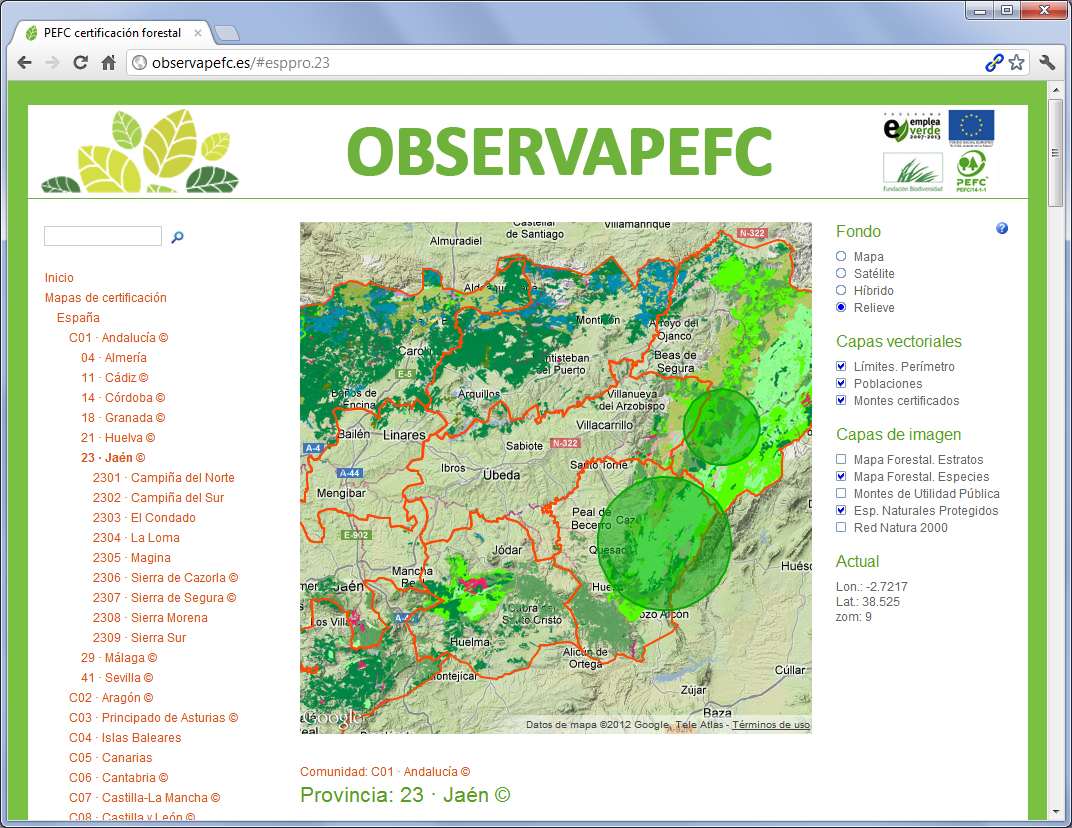 Web geográfica de áreas de bosques certificados, sobre mapas de Google. Contiene además capas del Mapa Forestal Español: estratos de suelo y especies arbóreas, todo ello organizado y acumulando cantidades, según las divisiones administrativas desde municipios hasta país.