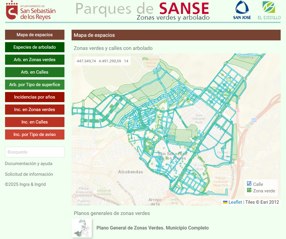 Web de inventario y conservación de zonas verdes del Portal de transparencia del ayuntamiento, mantenido por la contrata con información actualizada semanalmente. Incluye Catálogo de especies y Partes de incidencias