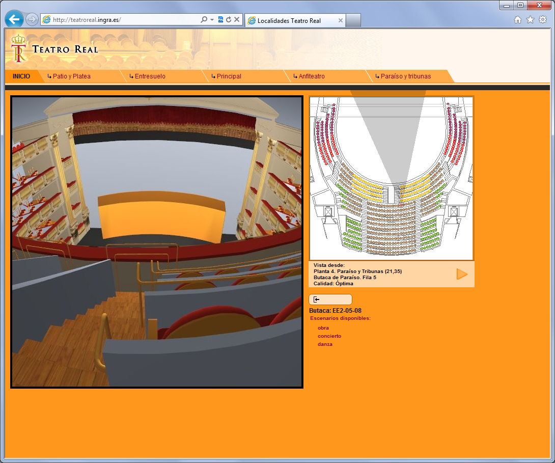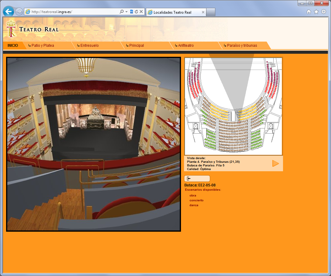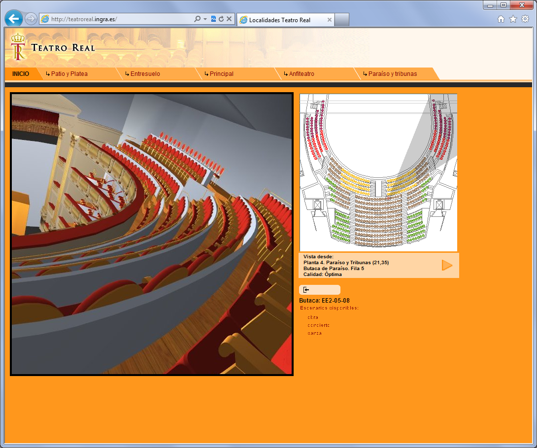 La información de planos 2D procede también de Ingrid y en la web sirve para la selección de la localidad a adquirir. En cada localidad se muestra una vista interactiva de un modelo 3D de la sala del Teatro, para verificar la visibilidad real del escenario desde esa localidad.