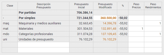 es decir, en cada clase indica un descuento de casi el 56% cuando el que hemos indicado sobre el total era del 50%. Esto es porque las unidades de obra sin descomposición (alzadas) no tienen peso de ajuste ni en precio ni en rendimiento, o sea no se ajustan, y por tanto ese importe de 76.000€ se distribuye entre las otras 3 clases.