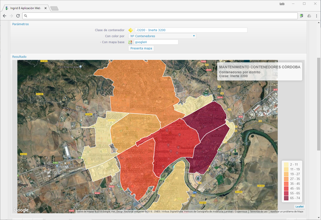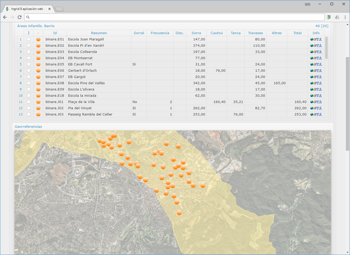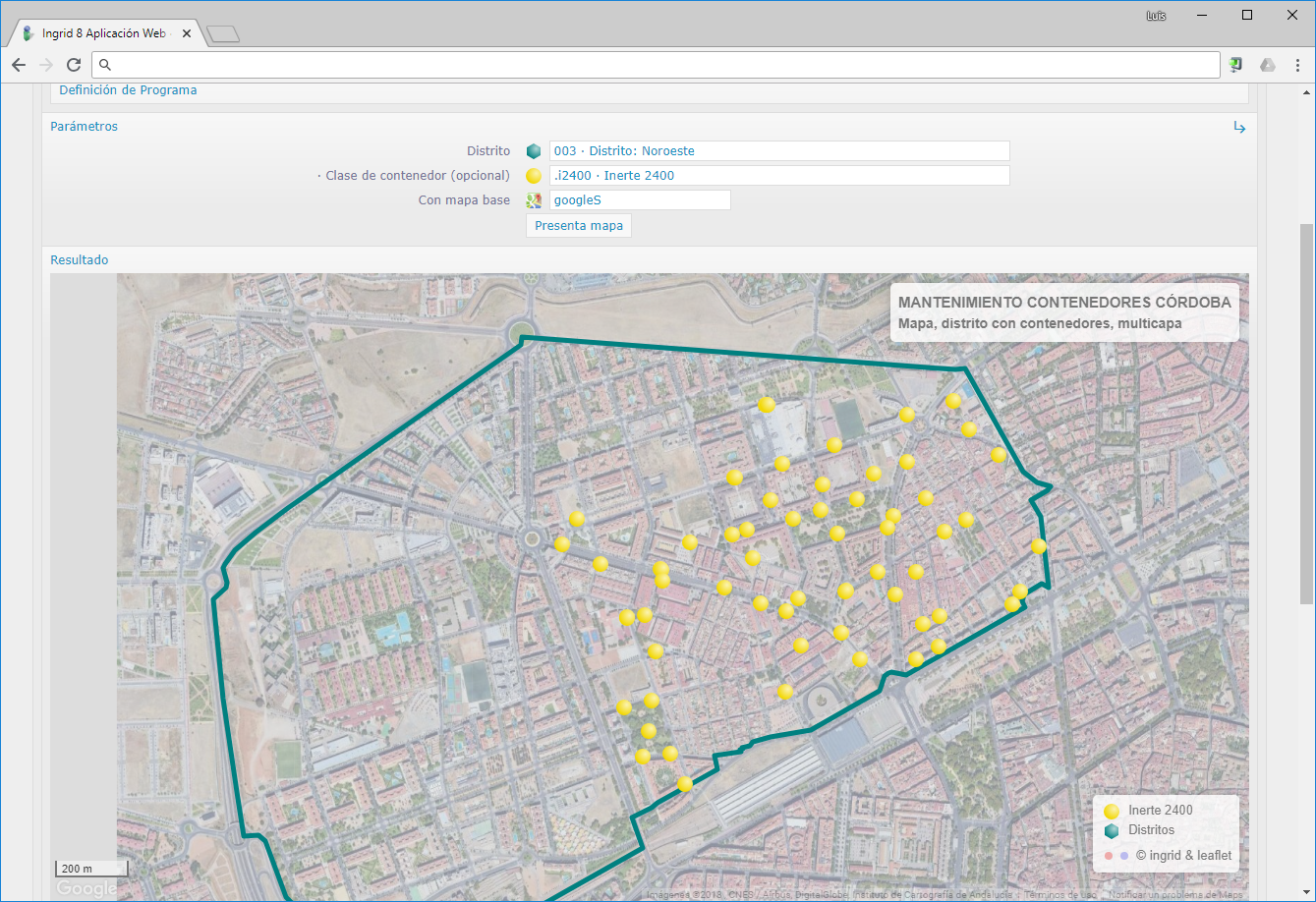 Inventario de contenedores por distrito. Esta salida, además de ser interactiva en la propia ventana de Ingrid, se puede volcar a un archivo HTML externo completamente independiente con la misma información interactiva. Muy útil para enviárselo a alguien o archivarlo.
