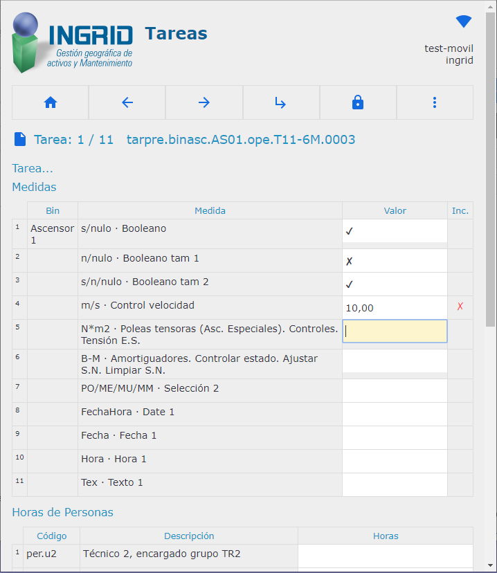 Permite descargar de la BD las tareas del día para el grupo de trabajo, y rellenar las medidas, posibles incidencias, adjuntar fotos y archivos, y leer códigos de barras y QR para localizar el objeto a mantener en vez de buscarlo en una lista. El parte se puede completar con el consumo de recursos de personal.