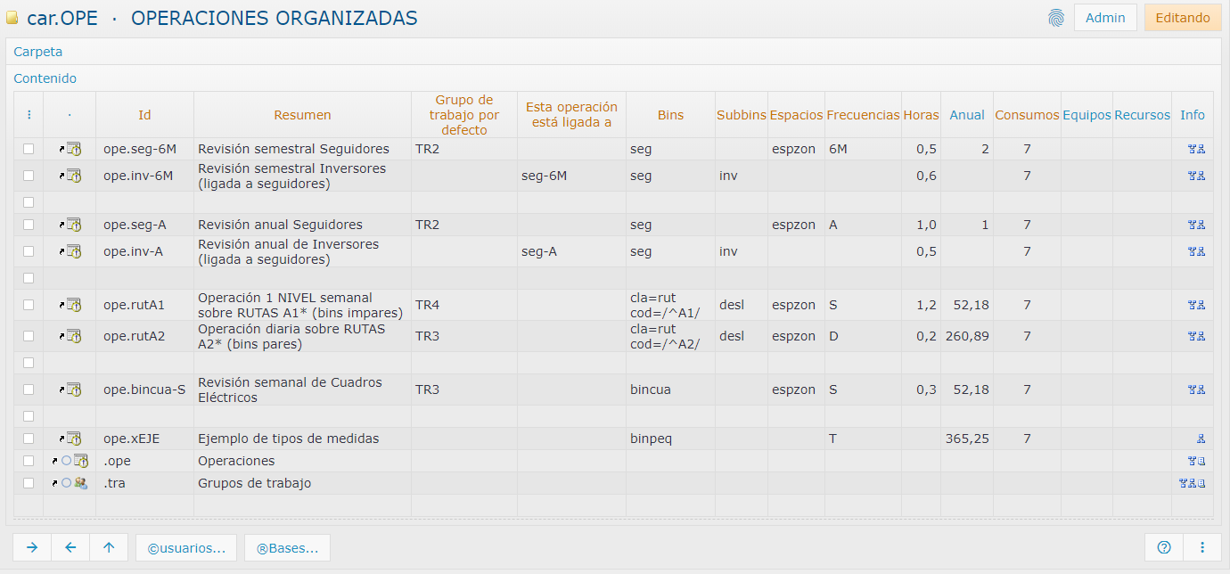 Cuadro con todas las operaciones y la información mínima que requieren: frecuencia de ejecución, sobre qué elementos de inventario (por gamas, códigos, ubicación en espacios, categorías, etc), grupo de trabajo asignado, ligadura temporal con otras tareas y medidas que las componen