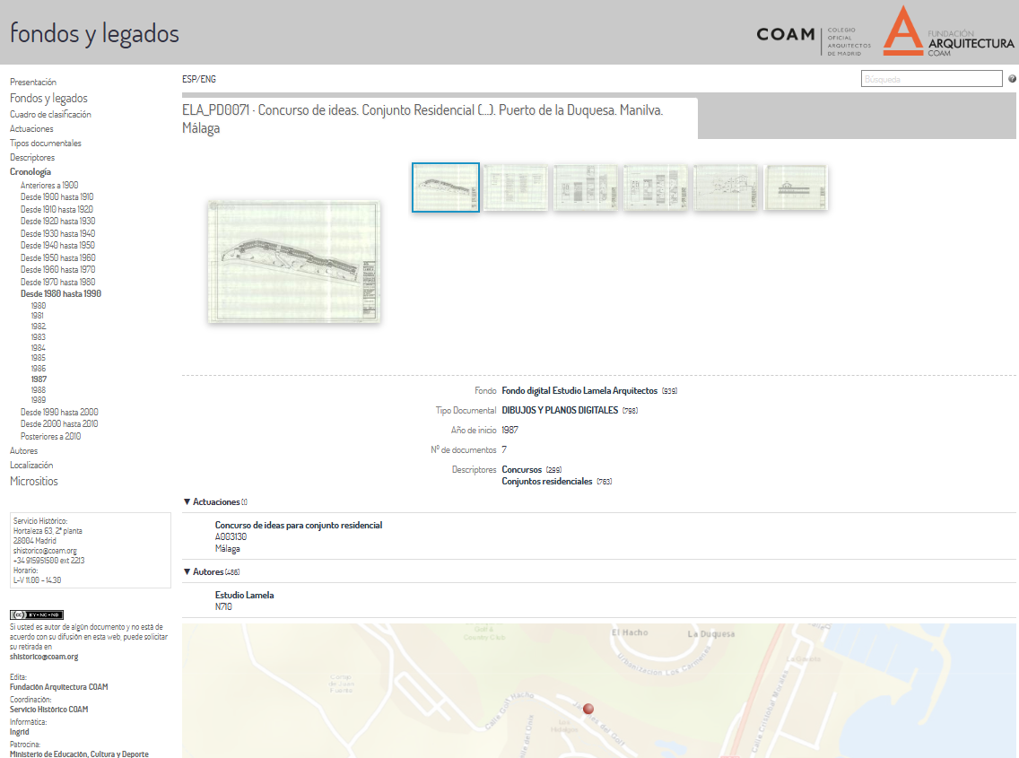 La web de fondos y legados del COAM, organiza la documentación publicada hasta nov-2019, unos 62 legados custodiados actualmente en el Colegio. Las unidades documentales, con sus imágenes se organizan por actuaciones, tipos documentales, descriptores, cronología, autores y localización geográfica. Las actuaciones se han completado hasta tener un mapa mundial de fondos