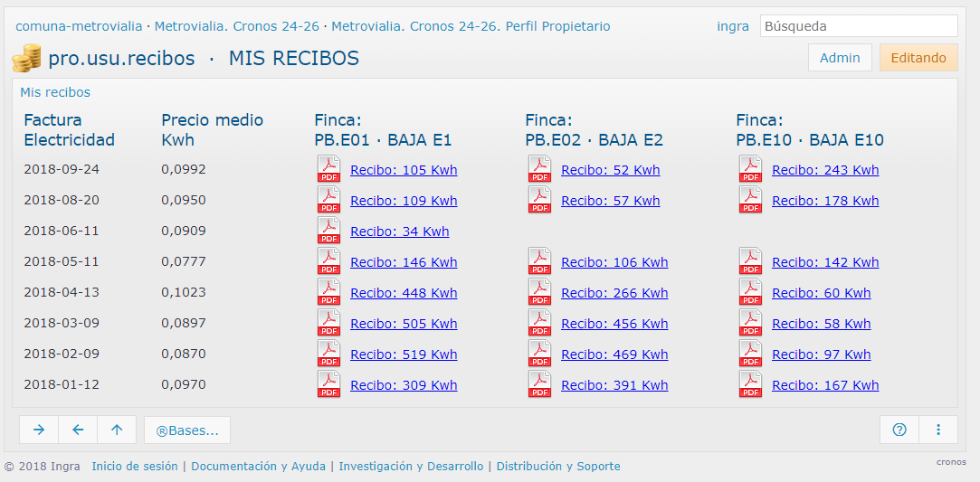 Recibo de comunidad de propietarios generado con los datos leídos diariamente del sistema de climatización de fancoils. Los recibos se generan con la factura que recibe mensualmente la comunidad de la empresa eléctrica y reparte el coste calculando el precio/kWh de esa factura mensual. Ingrid hace el envío de esa remesa de recibos por e-mail a todos los propietarios.