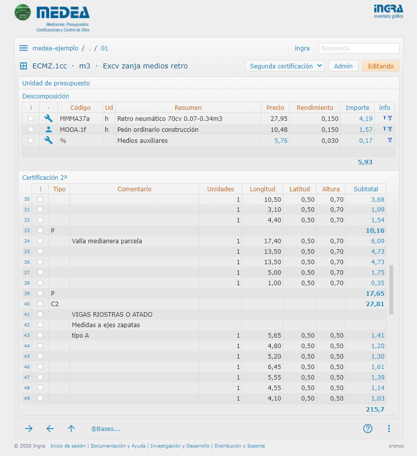 Las unidades de obra con medición directa (sin desglose) se certifican directamente en la ventana principal, en la columna donde se indican las cantidades certificadas: