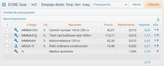Los medios auxiliares de maquinaria son un 100% (de forma irreal para facilitar el cálculo, o sea, rendimiento=1) del importe de las 4 líneas de maquinaria, y mano de obra, que suman 2,18€.