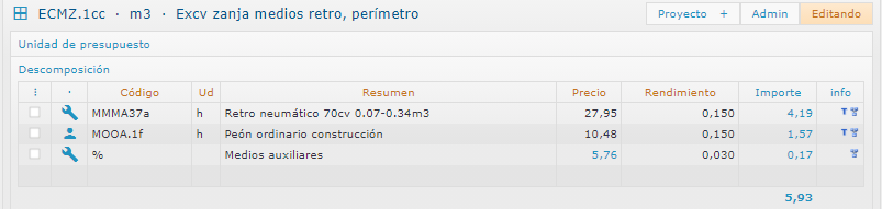 Al pie de la columna Importe se muestra calculado el de la partida, sumatorio de todos los de cada línea al multiplicar Precio de cada componente, por su Rendimiento.
